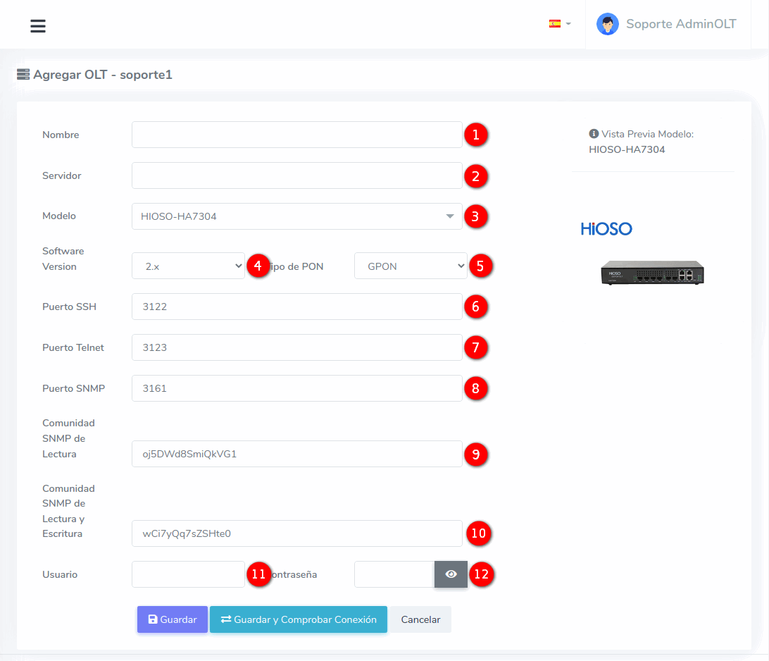 - Nombre: Se refiere a como nombrara a su OLT en el sistema AdminOLT. Este es definido por usted y no afectará a la conexión.
