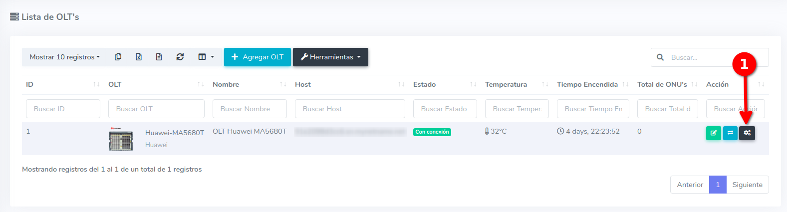 1Para poder crear la configuracion inicial en la OLT y crear una comunidad, dba, traffic table y libeprofile, es necesario ejecutar esta desde la vista de Lista OLT's.