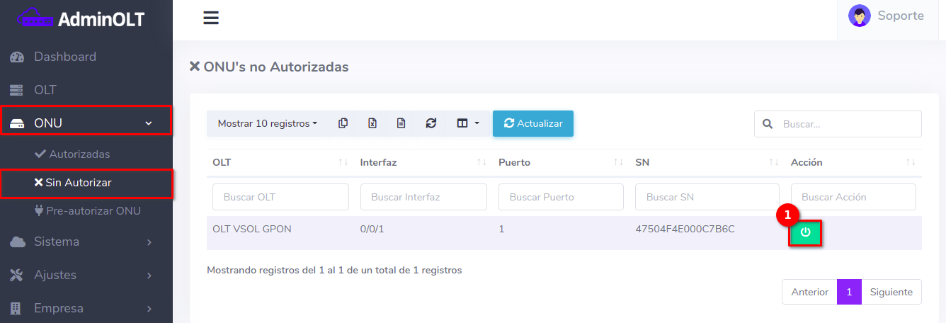 1Para ver los dispositivos que aún no han sido autorizados debemos dirigirnos a la sección ONU > Sin Autorizar y seleccionar alguna ONU disponible.