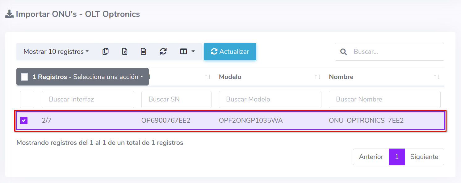 3Una vez que hayamos seleccionado los equipos, importamos las ONU's al sistema AdminOLT
