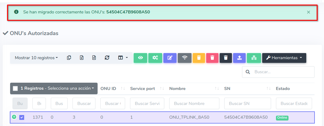 1 En ONU's > Lista de Onu's Autorizadas debemos escoger el equipo con el que se trabajará y seleccionar Migrar ONU a otra OLT que se encuentra en el botón con la leyenda Herramientas.