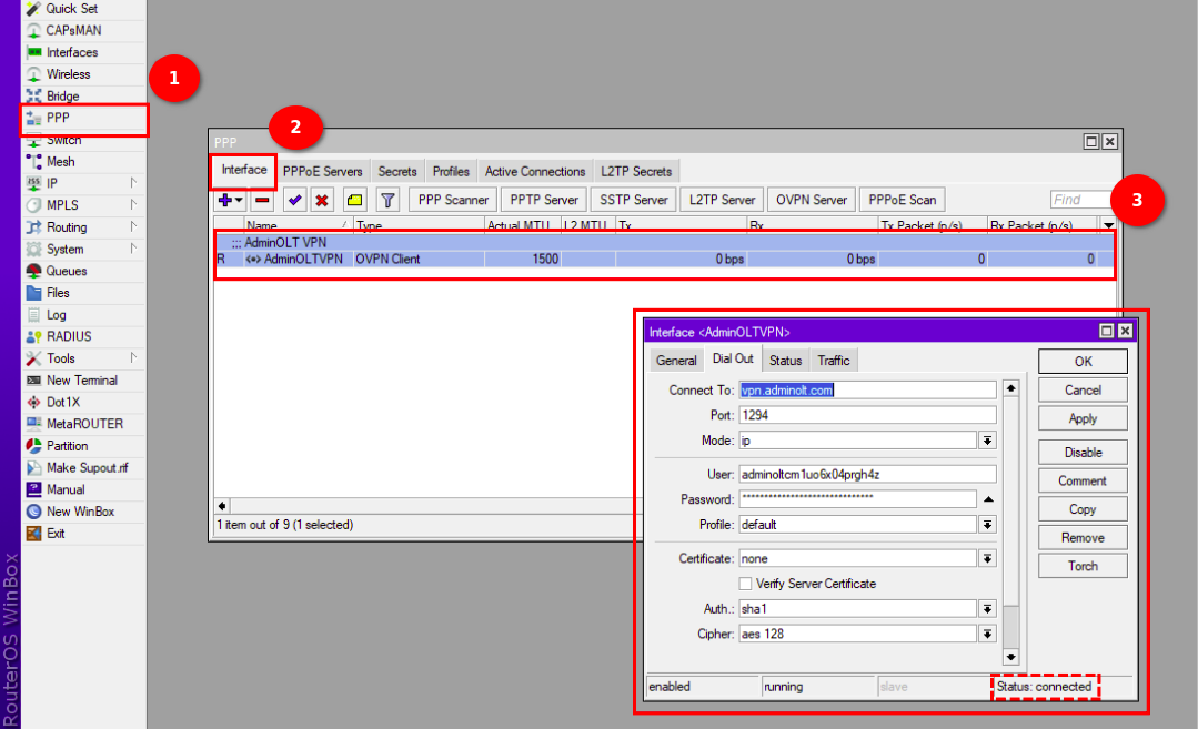 4 En la terminal de su Routerboard pegamos el script generado por AdminOLT y verificamos la conexión.