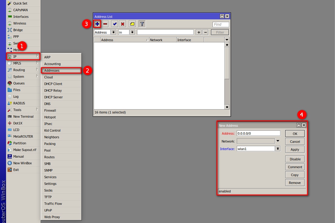 1 Nos dirigimos al apartado de Bridge en el menú de nuestro RouterBoard para crear la interfaz bridge1 y así poder agrupar los puertos que estarán trabajando en la red de la OLT.