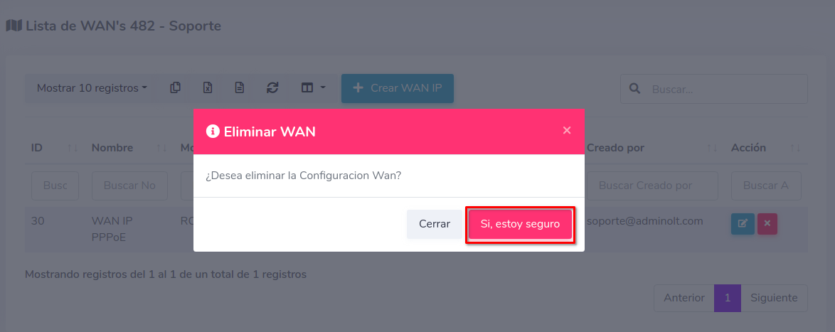 2Seleccione la opción Crear WAN IP y complete el formulario, con este proceso podrá autorizar y crear una WAN IP a una ONU al mismo tiempo.