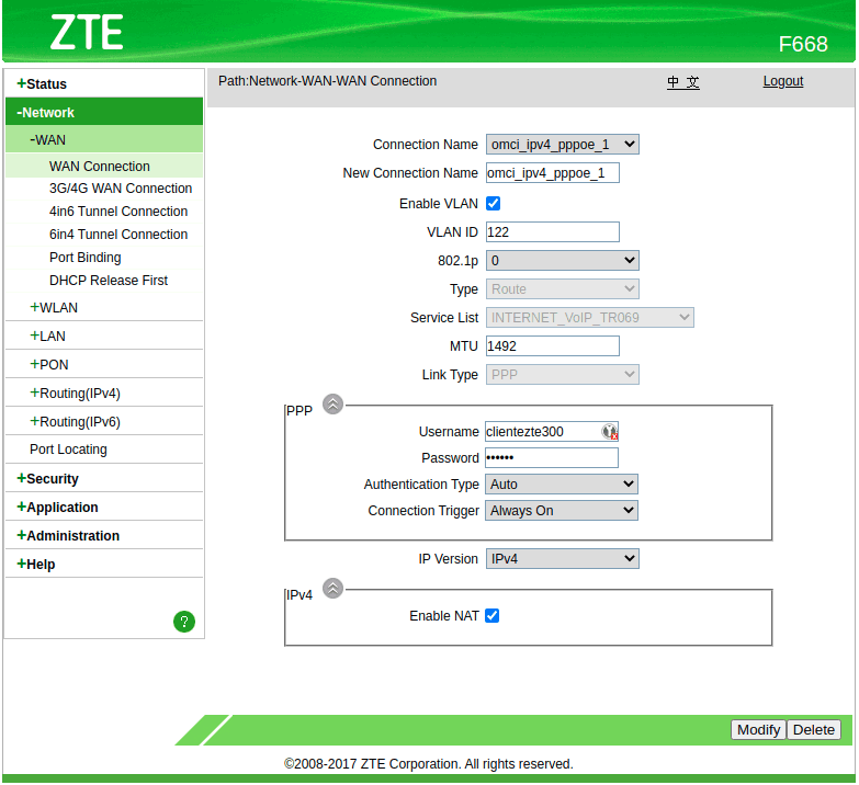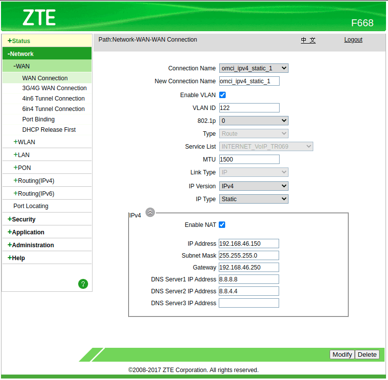 Al entrar a la interfaz de la ONU podremos ver que la configuración WAN se ha creado.