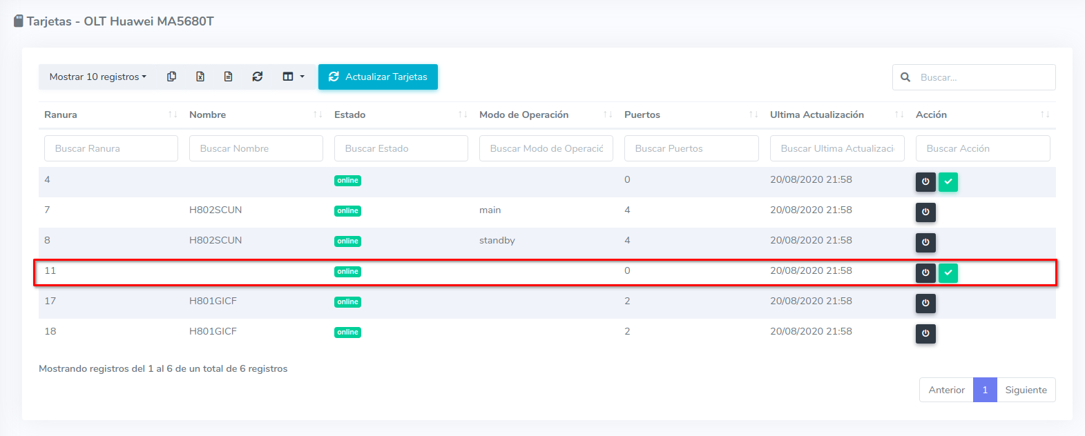 El sistema se conectará a la OLT y llevara a cabo el proceso. Una vez terminado será redirigido a la Lista de Tarjetas, donde podrá visualizar que la tarjeta ya tiene nombre.