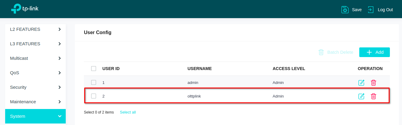Por seguridad es necesario crear un usuario en la OLT, el cual nos servirá para conectarlo con AdminOLT