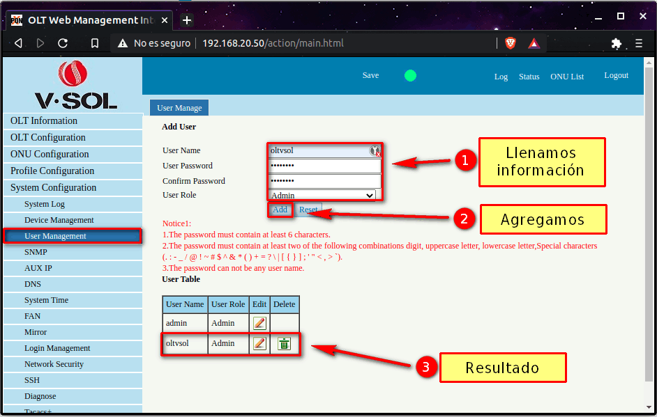 Por seguridad es necesario crear un usuario en la OLT, el cúal nos servirá para conectarlo con AdminOLT