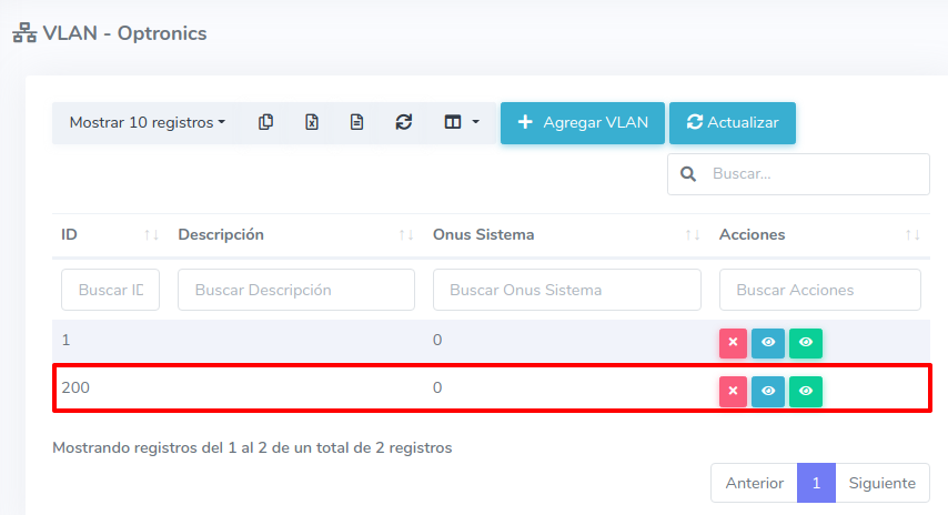 2 Después de agregar esta vlan en tu router, podremos agregarla en la OLT desde la Lista de OLT's seleccionando la OLT y la opción Lista de VLAN's.