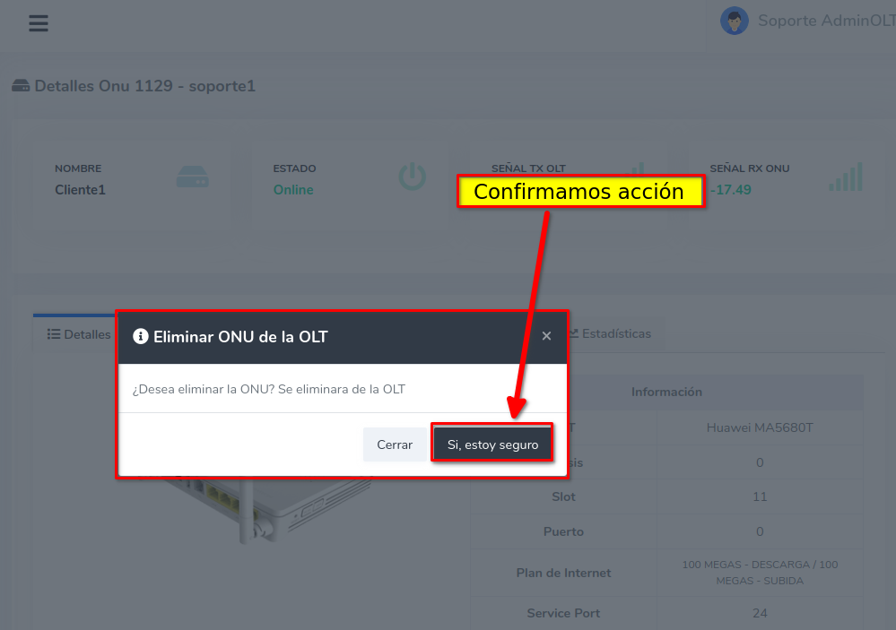 3 Confirmamos la acción de eliminar la ONU de AdminOLT