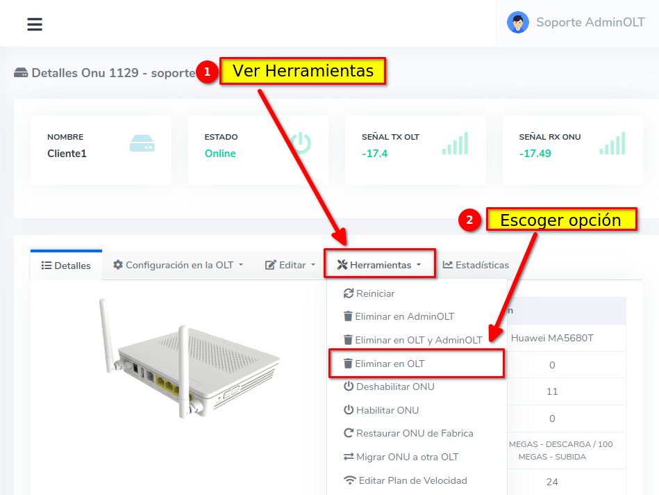 3 Vamos a Herramientas y escogemos Eliminar en AdminOLT