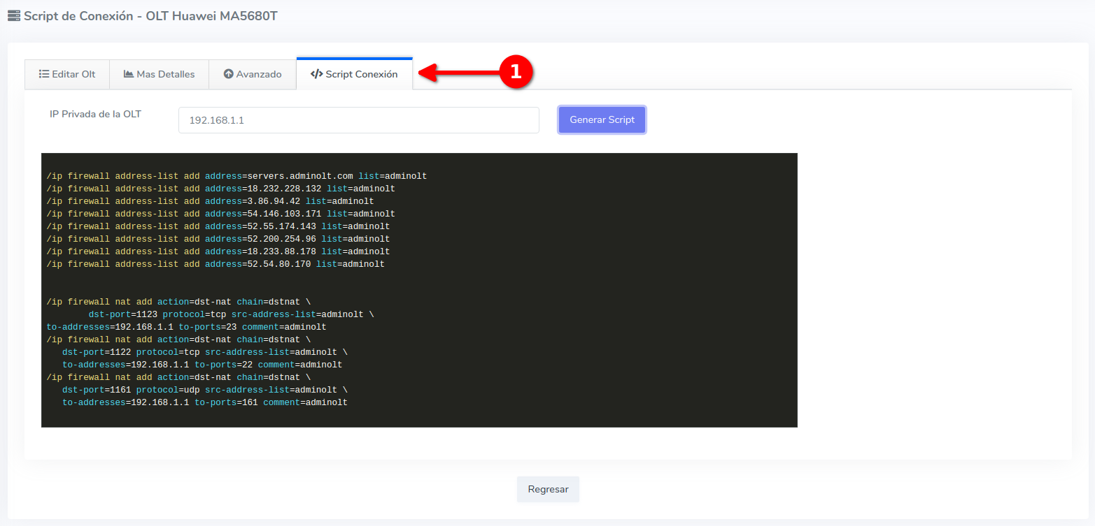 1 Para poder establecer la conexión de manera exitosa es necesario que generemos un script, para poder generarlo, nos dirigimos a nuestra OLT y seleccionamos la opción de editar.