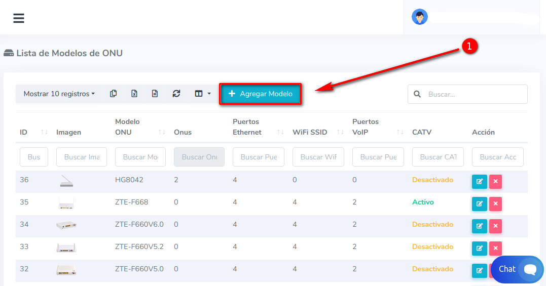 2 Una vez en la Lista de Modelos de ONU. Esto nos mostrara una lista con todas los Modelos de ONU's con las que contamos actualmente en AdminOLT. Para agregar un nuevo Modelo de ONU debemos seleccionar la opción Agregar Modelo.