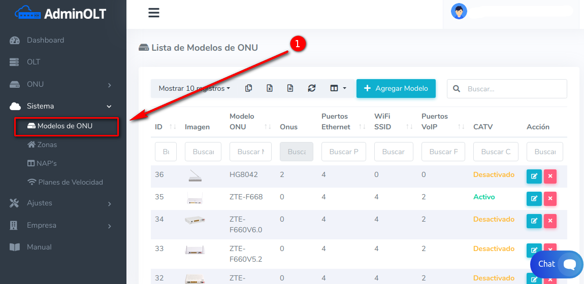 1 Primero debemos ir al menú lateral y seleccionar en la sección Sistema la opción Modelos de ONU.
