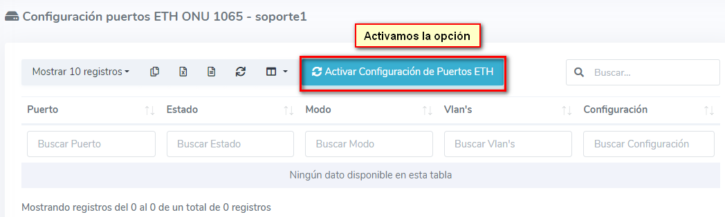 Como primer punto, seleccionamos la onu que autorizamos y vamos a la opción de configurar puertos ETH